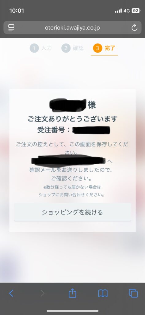 ↑この画面で「受注番号」が確認できると購入確定